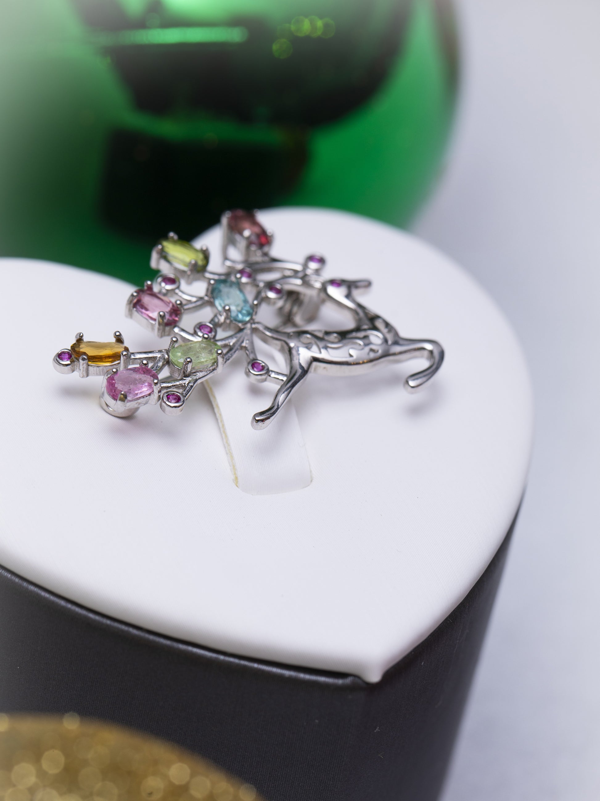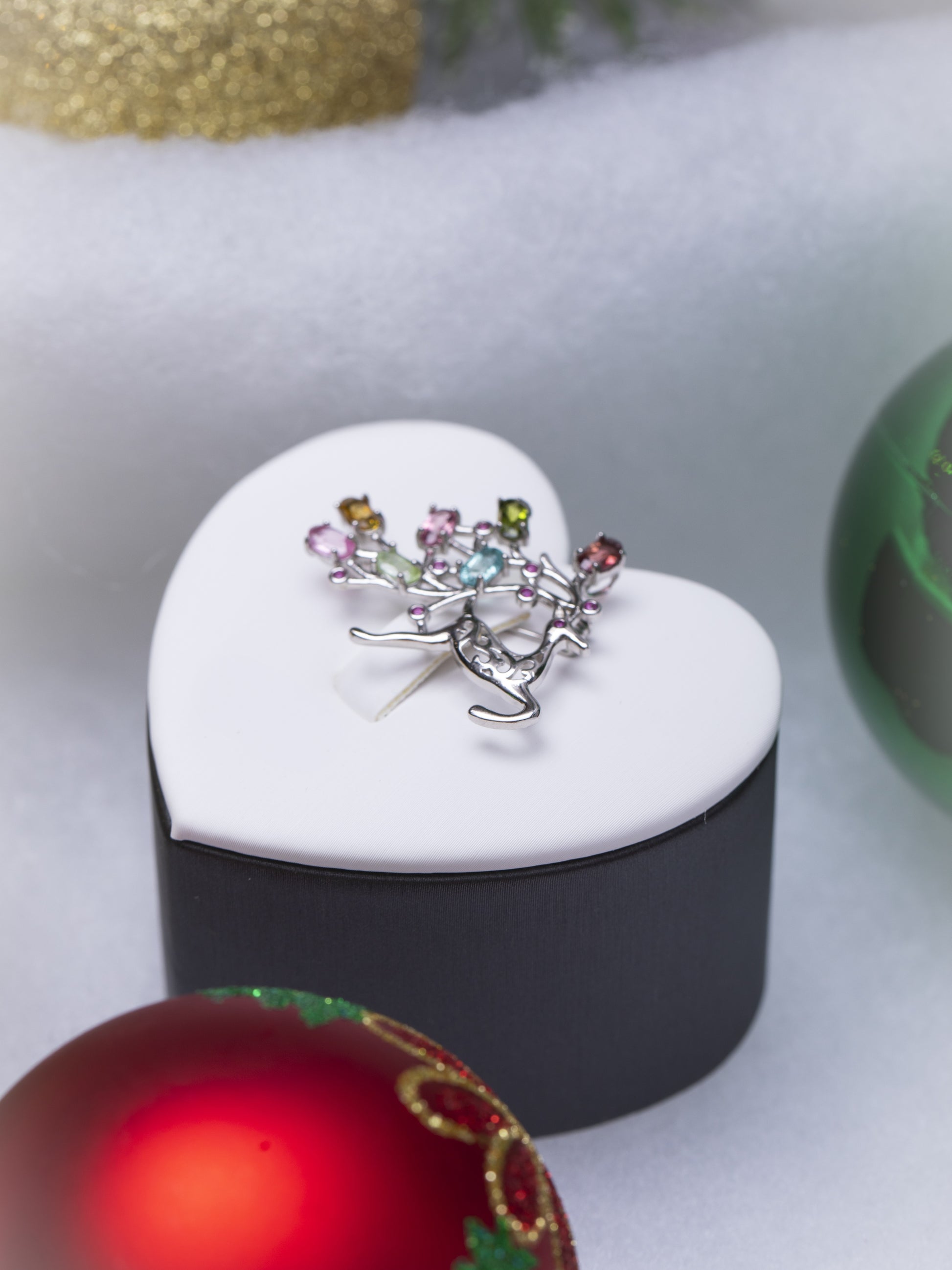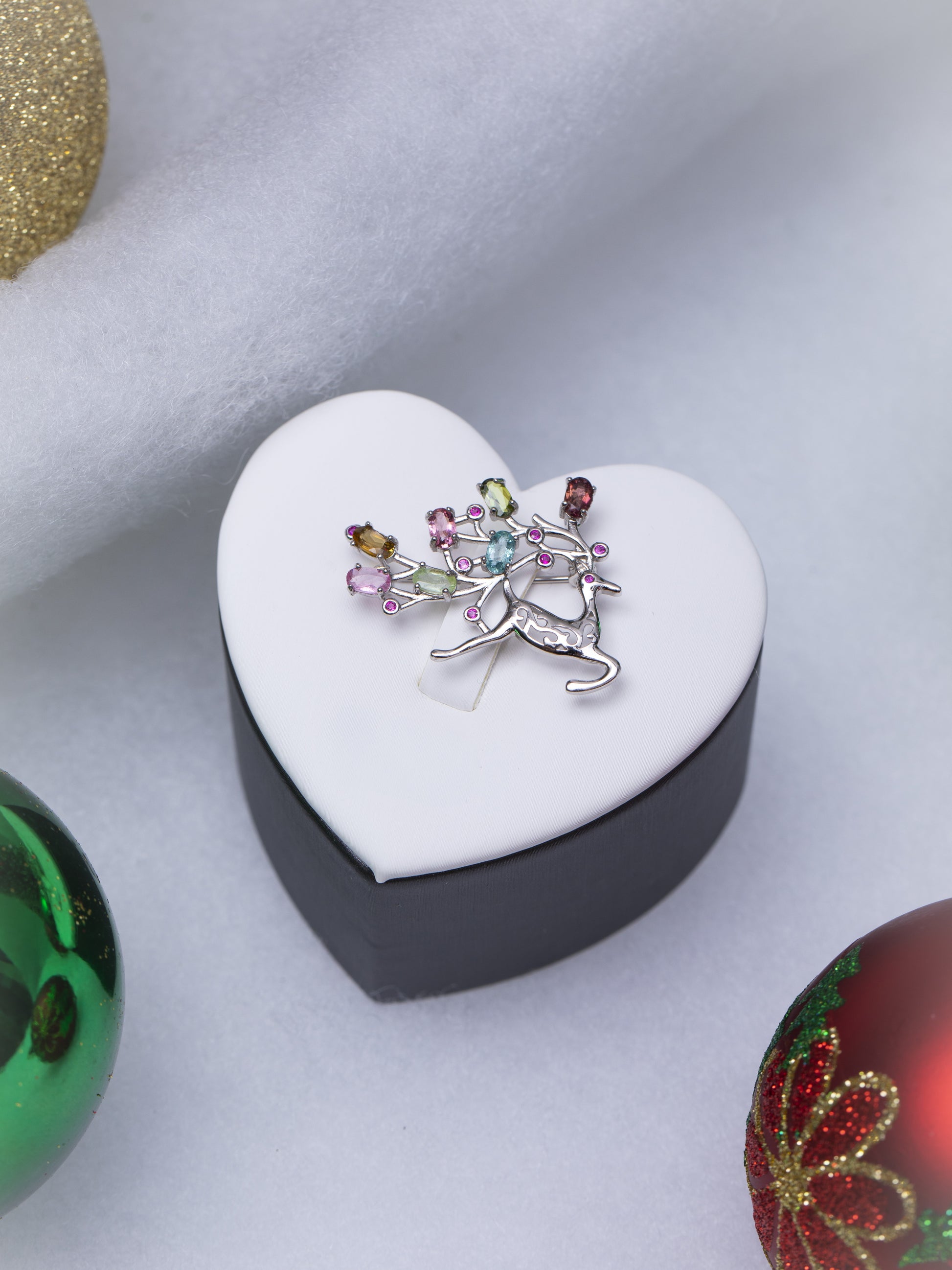 Este elegante broche de plata representa la silueta de un ciervo, destacando sus astas adornadas con turmalinas de colores en corte oval, sumando 2.6 ct. Cada gema ha sido cuidadosamente seleccionada, y el conjunto cuenta con certificación NGTC que garantiza su autenticidad y calidad. Una pieza sofisticada, perfecta para realzar cualquier atuendo durante la temporada navideña, combinando naturaleza y lujo con un diseño atemporal.