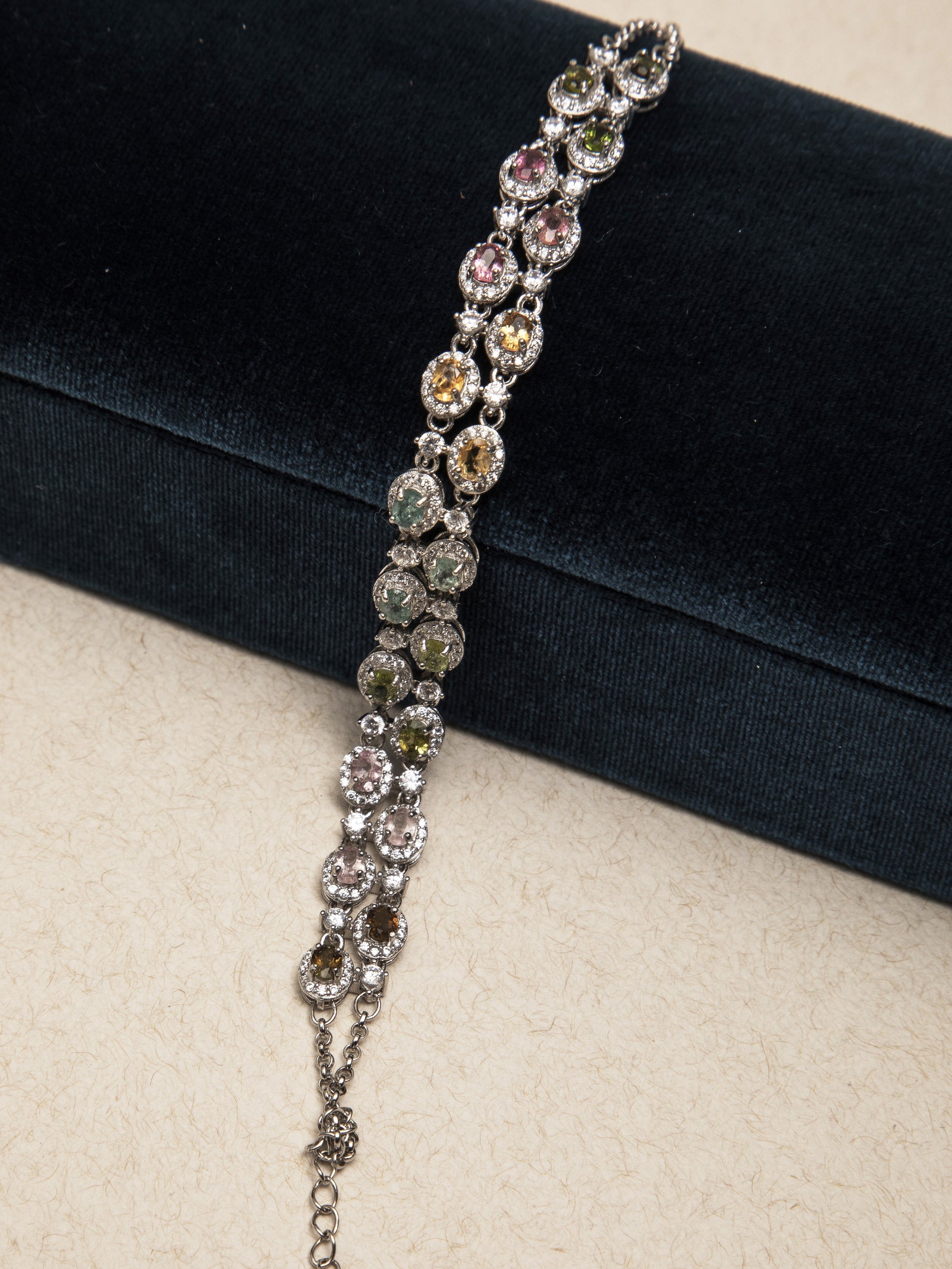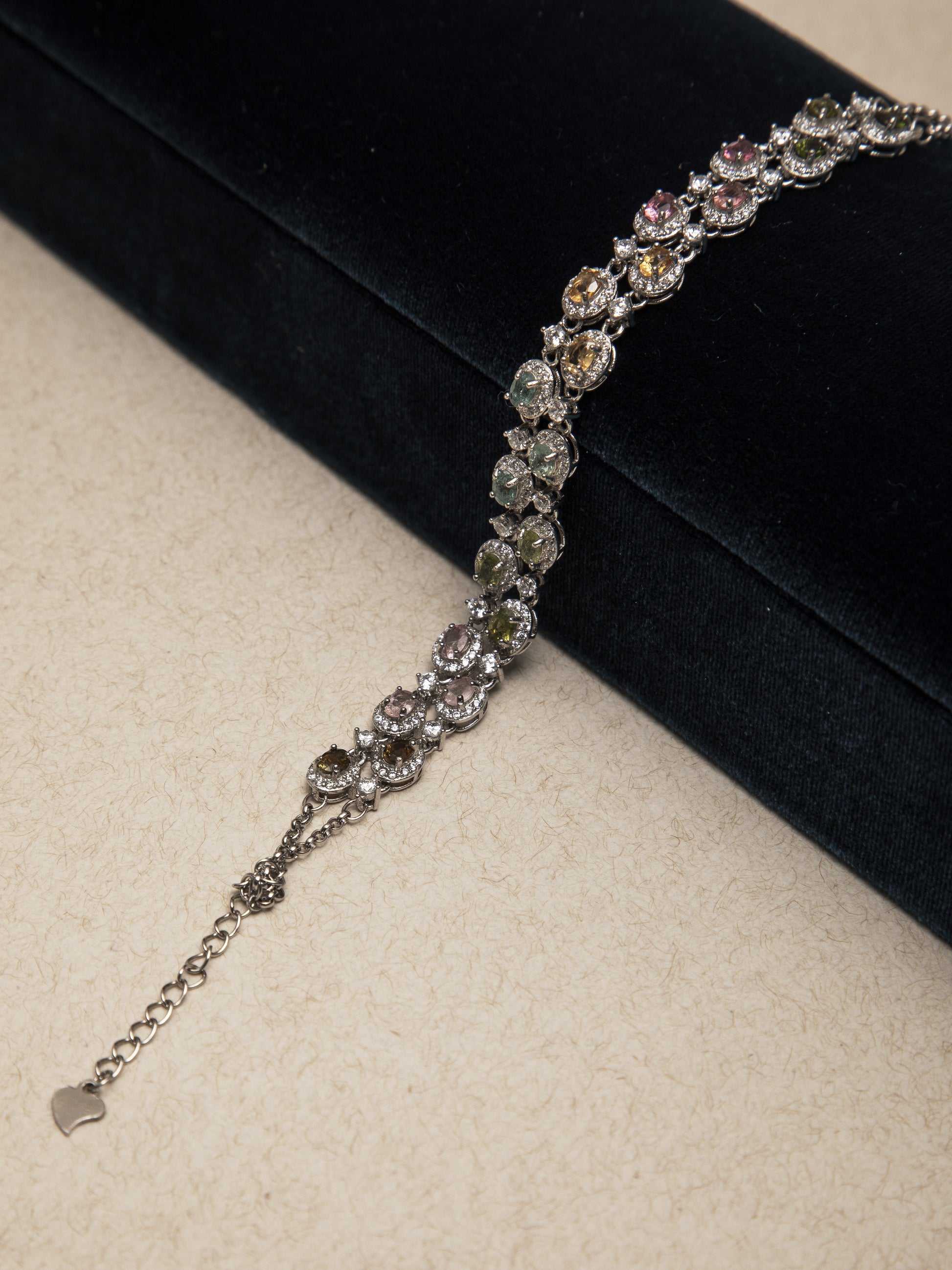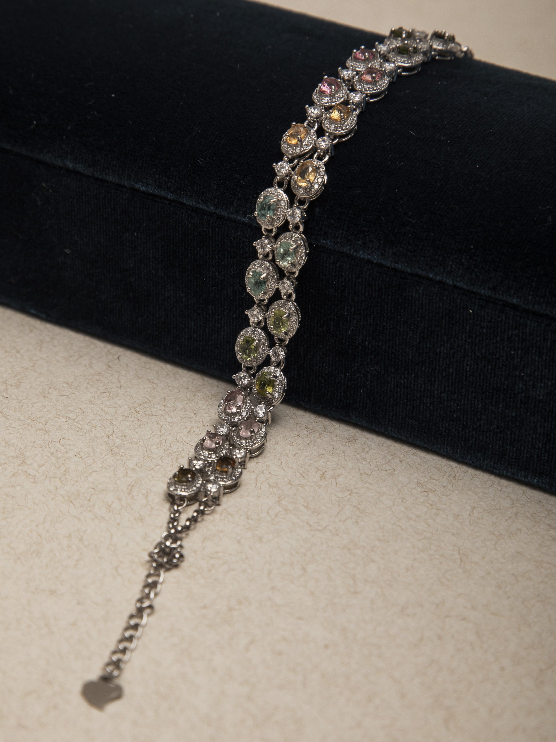 La pulsera Camino Arcoíris presenta una doble hilera de turmalinas ovales multicolores con un peso total de 7.5 ct, evocando la belleza vibrante de un arcoíris. Complementada con detalles en plata y zircones que realzan su brillo, esta pieza certificada por NGTC combina color y elegancia en un diseño único y sofisticado.